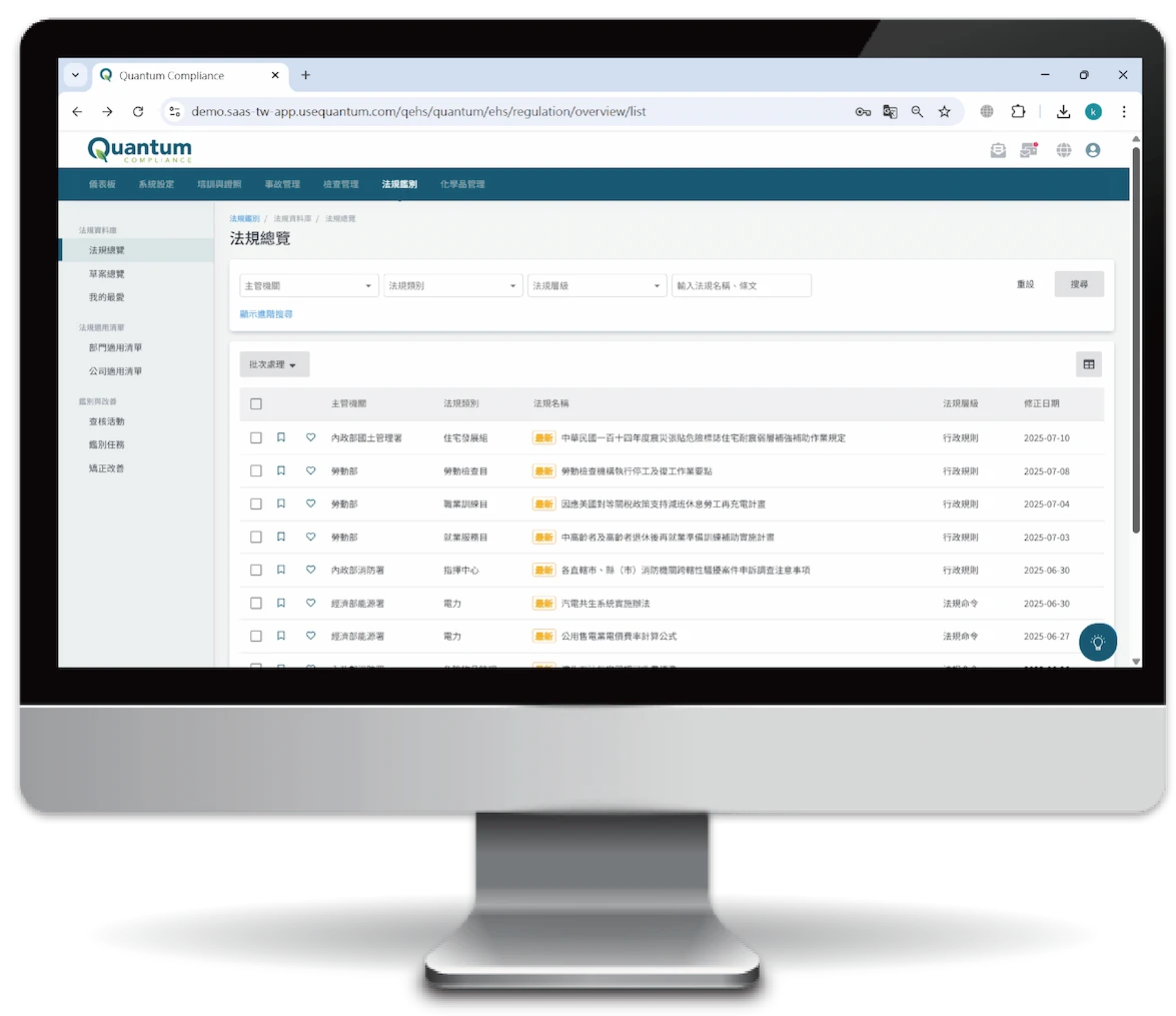 內建數十萬筆法規條文,完整涵蓋勞動部、環境部、消防署等多部會規範,提供企業完善的法規資料庫。