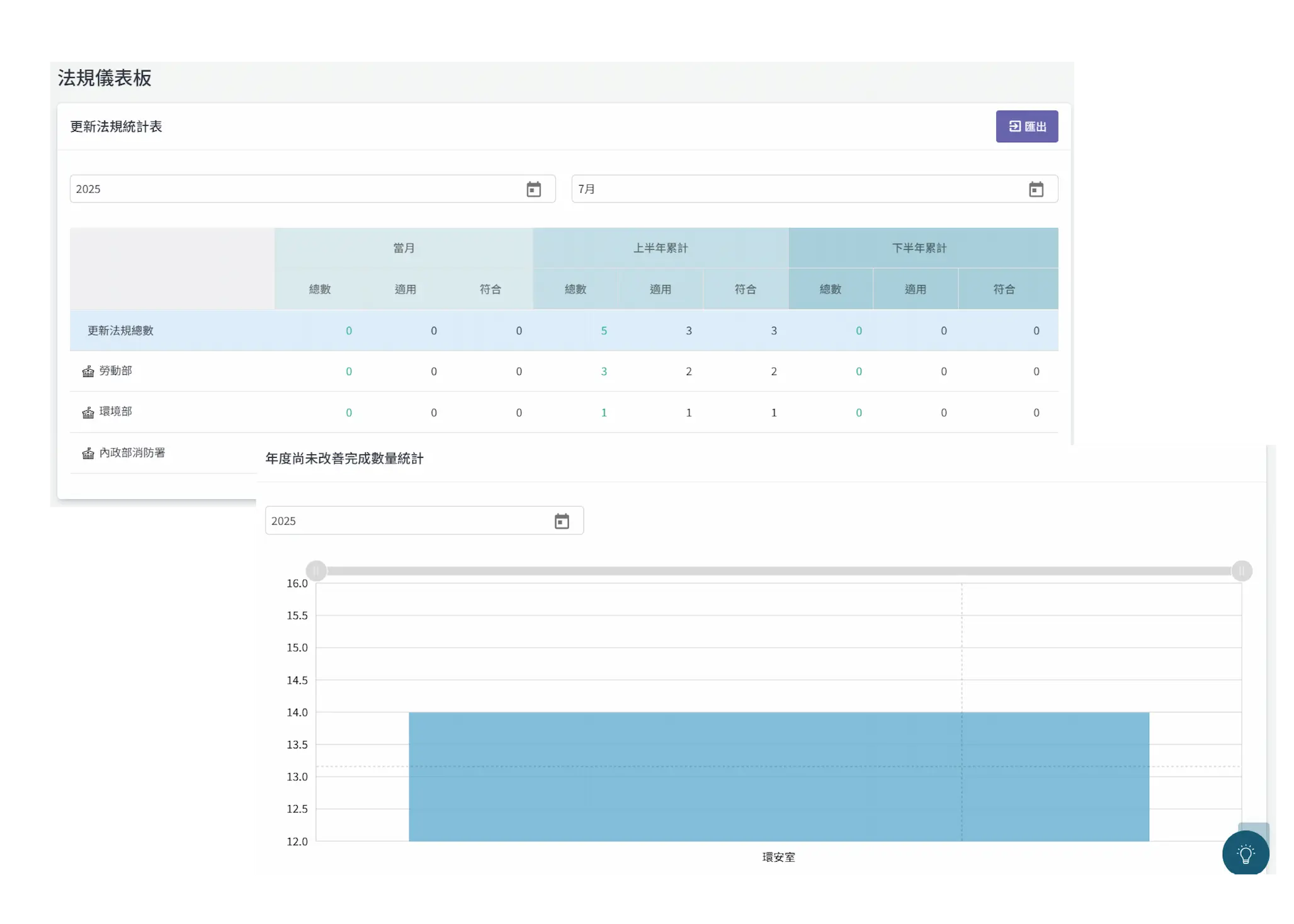 提供圖表化儀表板,統計更新法條數、未完成改善提醒等關鍵資訊,讓 EHS 與管理者可即時掌握全局狀況,加快決策與改善反應速度。